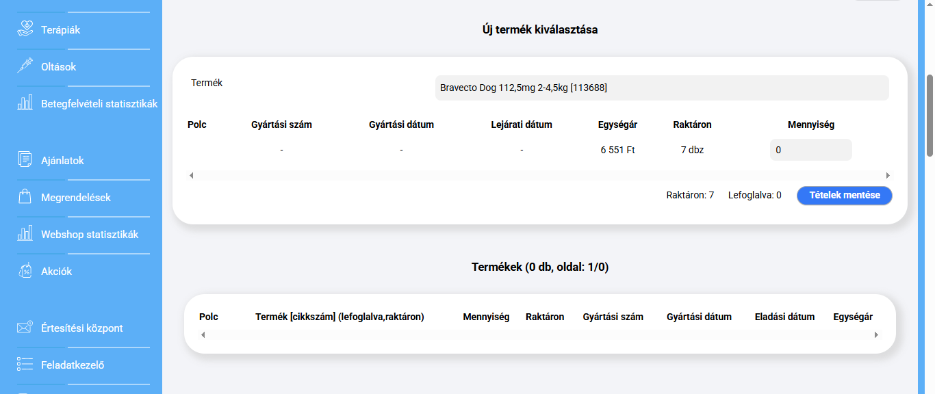 Ha elkészült, kattintson a „TÉTELEK MENTÉSE” gombra. Ezek után a termék megjelenik az alsó, „TERMÉKEK” szakaszban, ahol még szerkeszteni és  törölni is lehetséges.