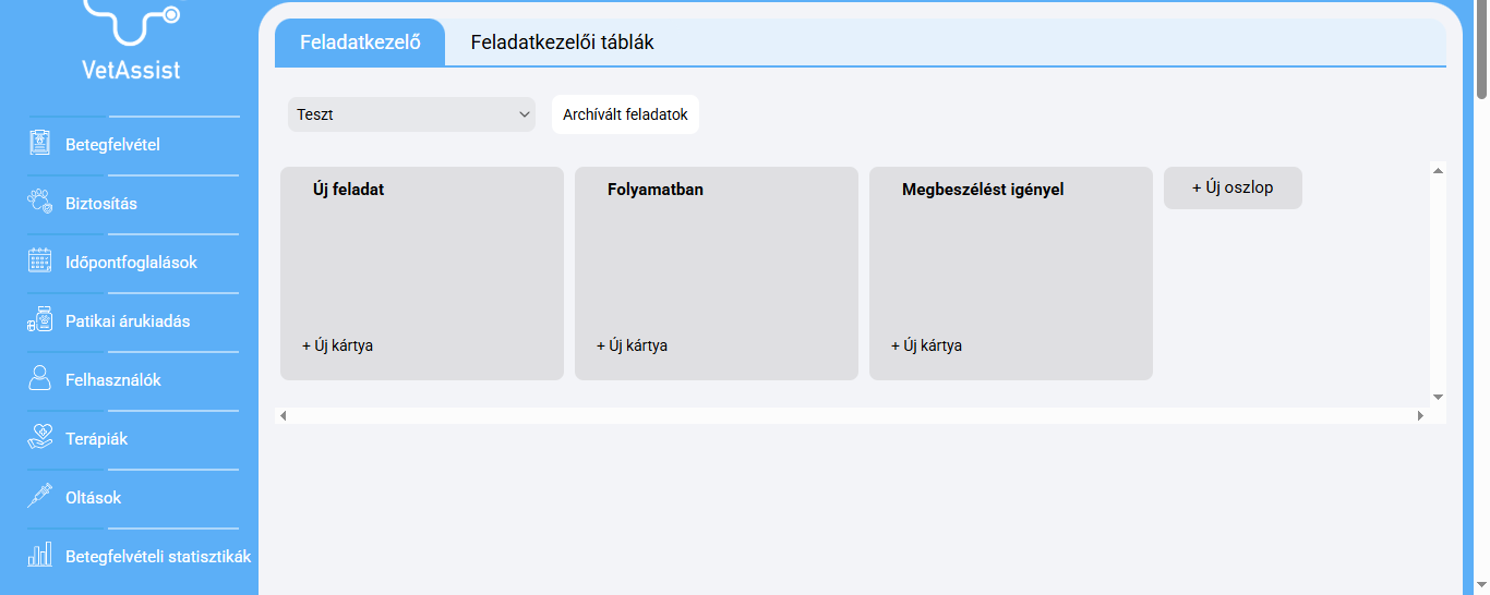 A VetAssist saját feladatkezelő rendszere segíthet a napi feladatok ellátásának optimalizálásában, a teendők észben tartásában, a feladatkiosztásban, illetve az utánkövetésben. Ebben az útmutatóban megnézzük, hogyan hozhat létre új táblákat, illetve hogyan szabhatja azokat saját igényeire.