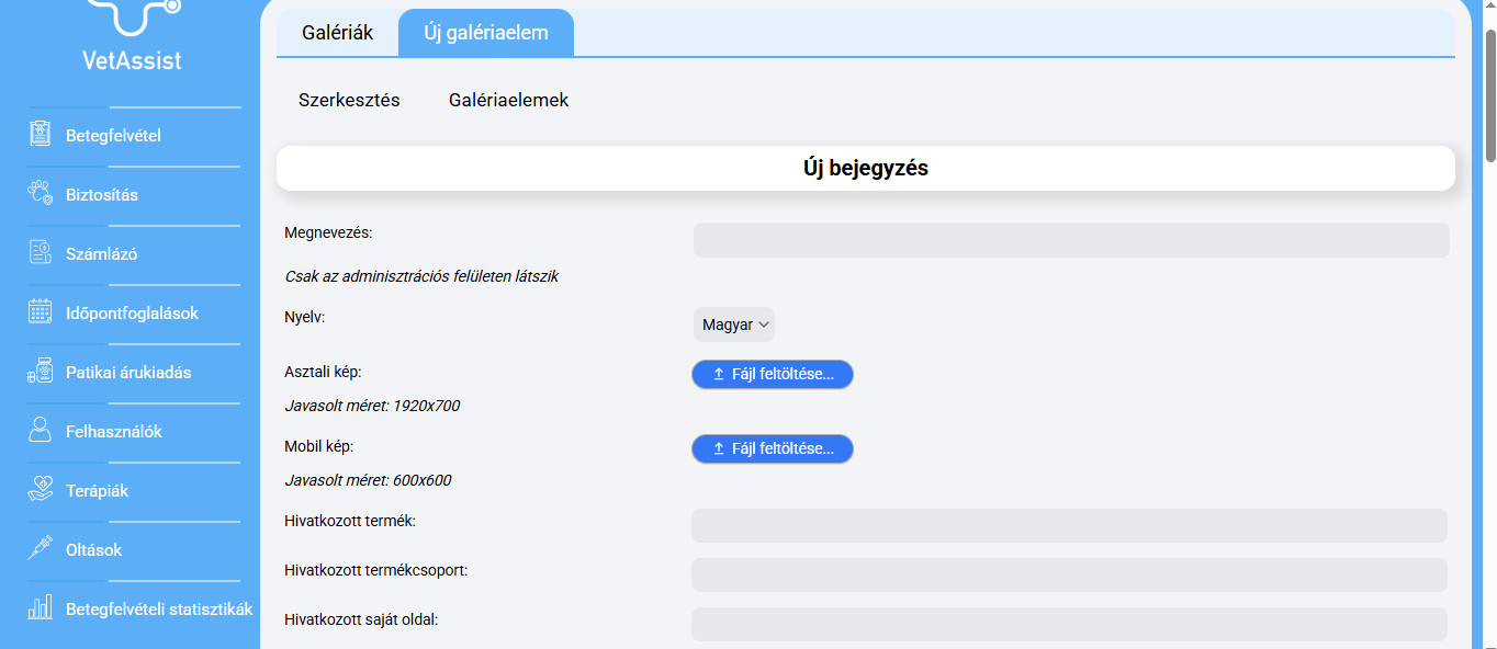 Új főoldali mozaik feltöltéséhez először is kattintson a „GALÉRIÁK” menüre, majd azon belül a „FŐOLDALI MOZAIK” kártyán válassza a „GALÉRIAELEMEK” lehetőséget. A megjelenő oldalon kattintson az „ÚJ GALÉRIAELEM LÉTREHOZÁSA” gombra. FONTOS! Az ideális megjelenés érdekében mind a három képméretből fel kell töltenie egyet-egyet, amiket a rendszer automatikusan egymás mellé fog rendezni.