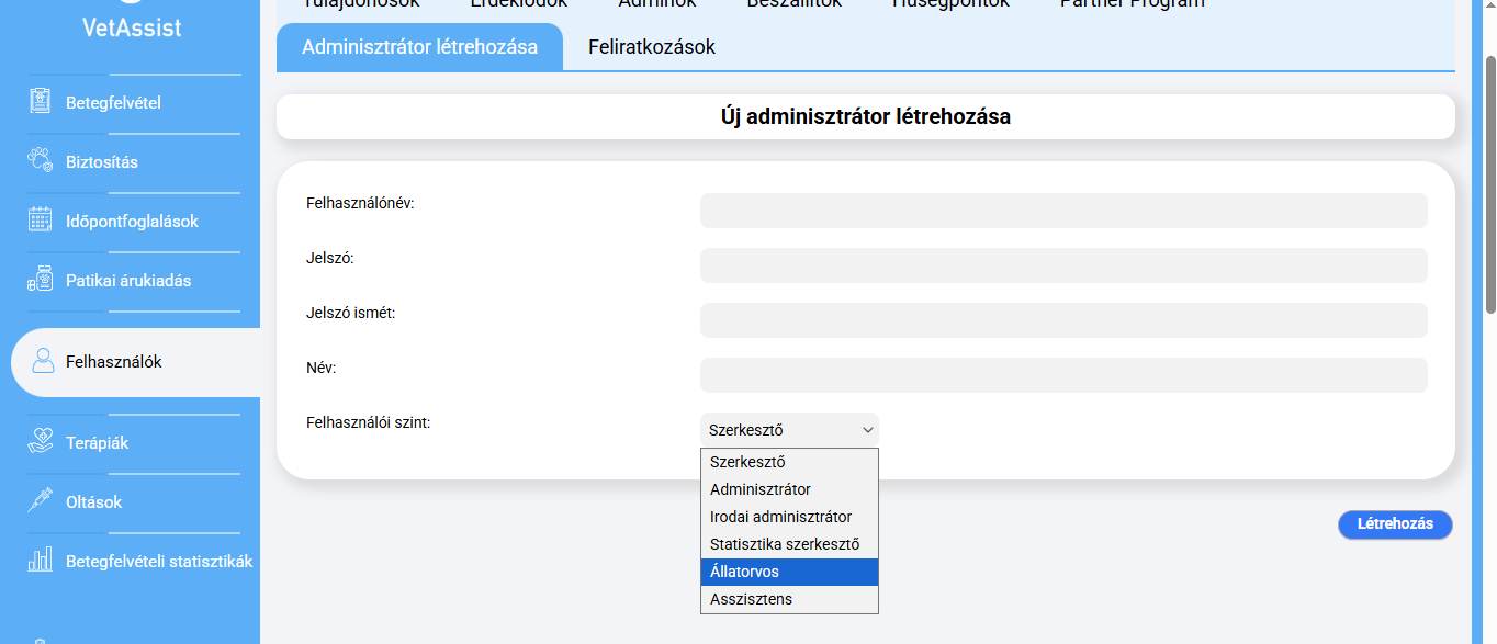 A „FELHASZNÁLÓI SZINT” mezőbe mindig a munkakörnek megfelelő opciót kell kiválasztani, ez ugyanis módosítja az űrlap további részein megjelenő beállítási lehetőségeket. Ha új állatorvosi felhasználót hozna létre, kattintson az „ÁLLATORVOS” lehetőségre. Ha végzett, kattintson a „LÉTREHOZÁS” gombra.