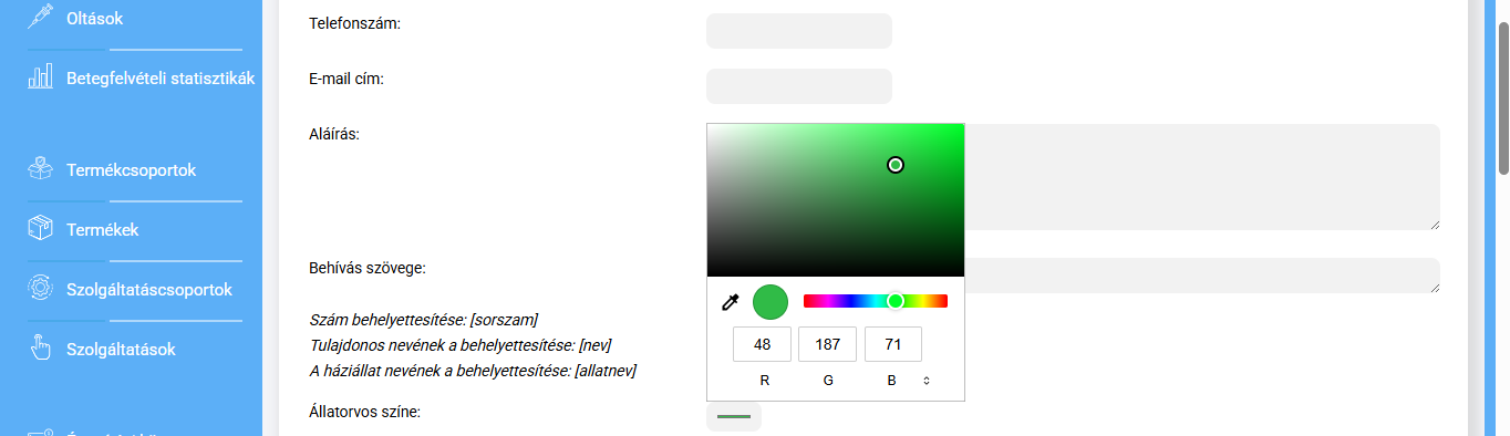 Egy-egy állatorvoshoz, adminisztrátorhoz külön színkód is tartozhat. Ez a színkód megjelenik a várótermi behívórendszer használata közben, illetve az időpontfoglalási naptár használatakor is. Egyedi szín beállításához lépjen a „FELHASZNÁLÓK” menübe, majd az „ADMINOK” fülre. A megjelenő listában keresse meg a szerkeszteni kívánt adminisztrátort, majd a megfelelő kártyán kattintson az „ADATLAP” gombra.