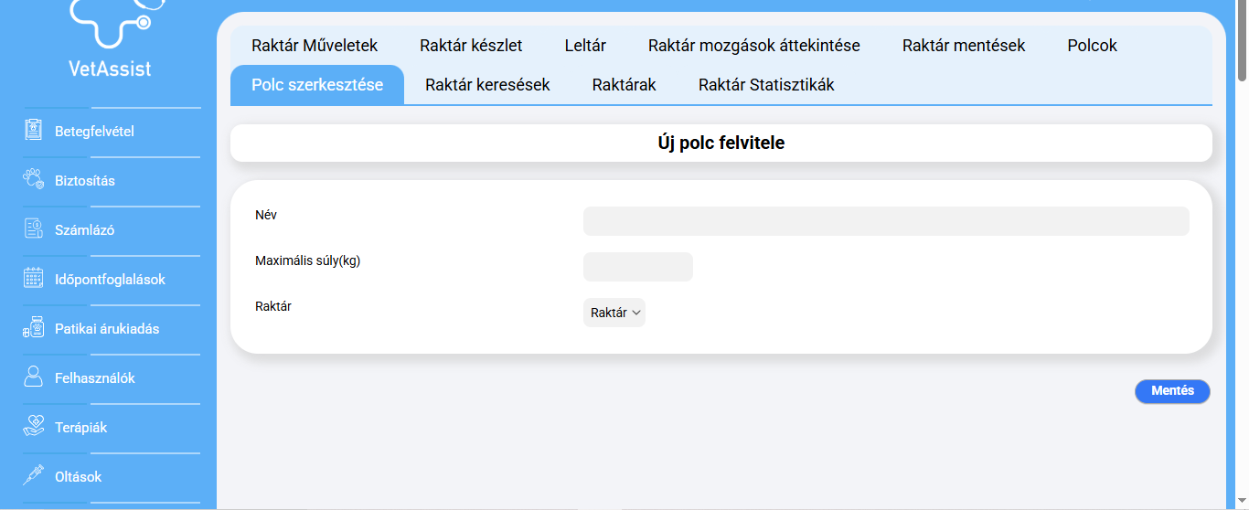 Ahhoz, hogy a termékeket a VetAssistban is polcok szerint tudja rendezni, először is fel kell vinni magukat a polcokat. Ehhez először is kattintson a „RAKTÁROZÁS” menüre, majd azon belül a „POLCOK” fülre. Új polc beállításához kattintson a „+” jelre, majd töltse ki a rövid űrlapot.