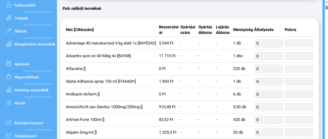 Ilyen módon meg fog nyílni a polcra még nem helyezett termékek listája. Az „ÁTHELYEZÉS” oszlopban megadhatja, hány darab terméket helyezne el az adott polcon, a „POLCRA” oszlopban pedig a polc nevét kell megadnia.