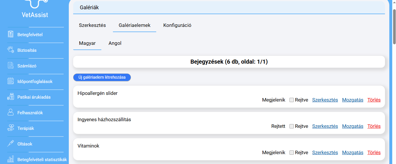 Új slider feltöltéséhez először is kattintson a „GALÉRIÁK” menüre, majd azon belül a „FŐOLDALI SLIDESHOW” kártyán válassza a „GALÉRIAELEMEK” lehetőséget. A megjelenő oldalon kattintson az „ÚJ GALÉRIAELEM LÉTREHOZÁSA” gombra.