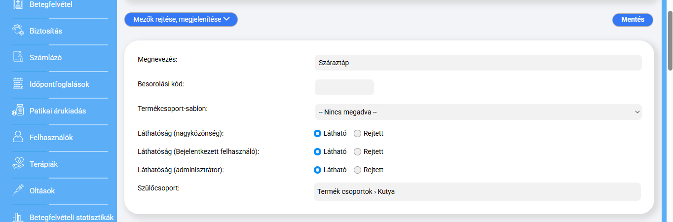 „LÁTHATÓSÁG (ADMINISZTRÁTOR)” mező: Ha a „LÁTHATÓ” opciót választja, akkor az adminisztrációs felületen elérhető lesz a termékcsoport a bejelentkezett VetAssist felhazsnáló számára. Érdemes minden esetben ezt a lehetőséget választani.