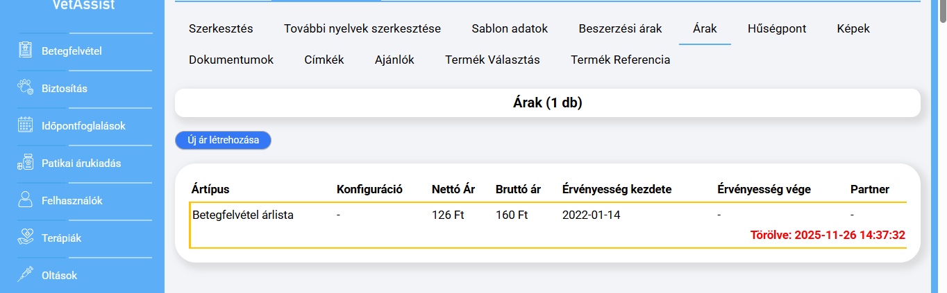 Ár törlése esetén a törölt árról továbbra is látni fog információt a rendszerben, ilyen módon: