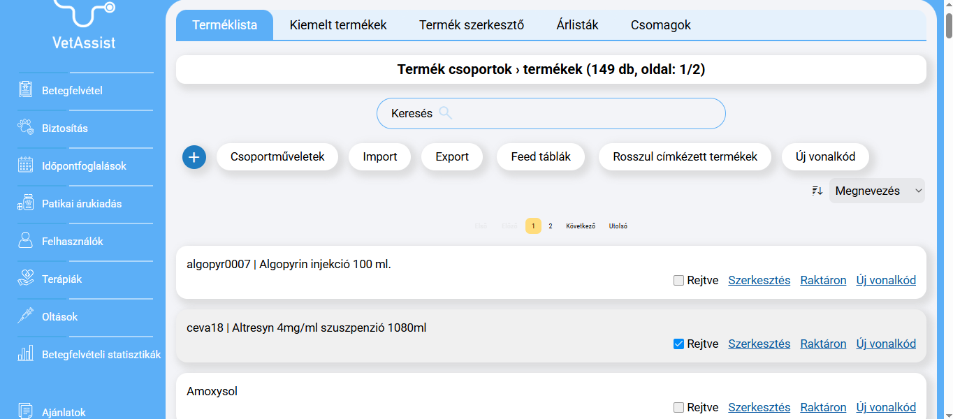 A VetAssist rendszerbe számos termék, gyógyszer alapvetően elérhető, de szüksége lehet ezek szerkesztésére, valamint új cikkek feltöltésére. Ebben a leírásban bemutatjuk, hogyan vihet fel manuálisan új gyógyszereket, illetve hogyan szerkesztheti ezeket, vagy a korábban már feltöltött cikkeket.