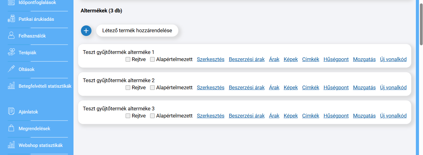 - Gyűjtőtermék esetében árak megadására az altermék szerkesztésénél lesz lehetőség.