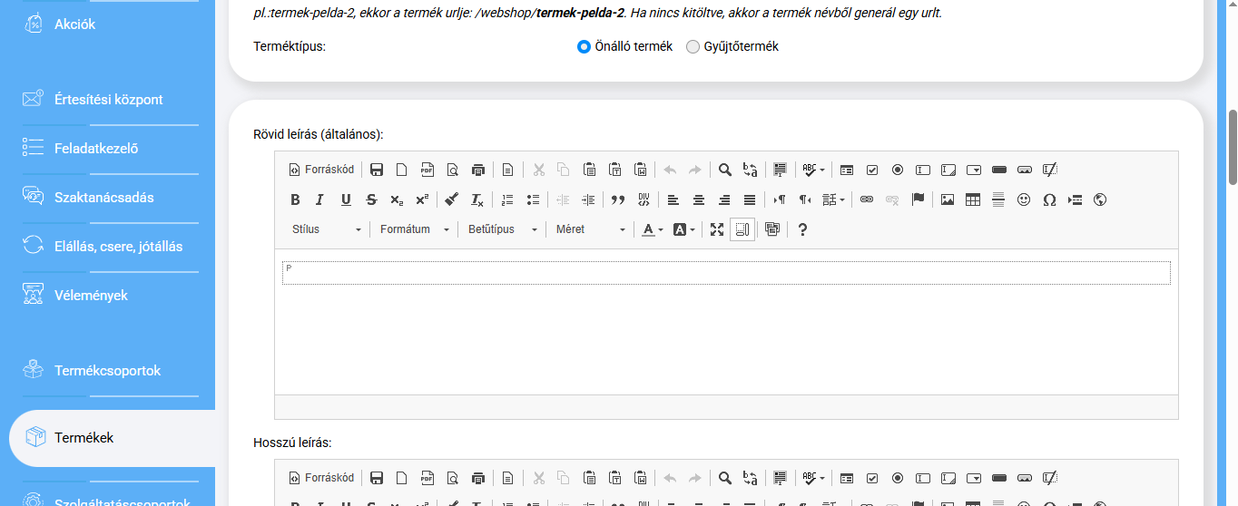 „RÖVID LEÍRÁS”, „HOSSZÚ LEÍRÁS”, „ÖSSZETÉTEL”, „ANALITIKAI ÖSSZETEVŐK”, „ETETÉSI JAVASLAT”, „ADALÉK ANYAGOK” mezők (webáruháznál fontos): Ezekben a mezőkben a termékek leírását adhatja meg, aminek akkor van nagyobb jelentősége, ha Ön webáruházat is üzemeltet. A leírások meg fognak jelenni a termékoldalon, ahol a látogatók el tudják azt olvasni, ugyanakkor ennek keresőoptimalizálási szerepe is van. Gyűjtőtermék feltöltése esetén ezeket a mezőket az altermékek szerkesztésénél töltse ki, ahol típusonként egyedi leírást adhat meg.