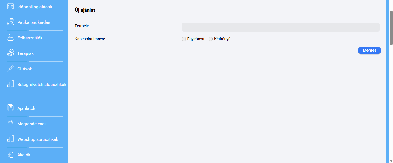 „KAPCSOLAT IRÁNYA” mező: Ebben a mezőben azt határozhatja meg, hogy az ajánlás csak az egyik terméknél jelenjen meg, vagy a két cikkben egymásra utaljanak a termékek. Egyirányú: az aktuálisan szerkesztett termékoldalon megjelenik az ajánlás. Kétirányú: Az aktuálisan szerkesztett termékoldalon megjelenik az ajánlás, az ajánlott termék oldalán pedig megjelenik az aktuálisan szerkesztett cikk – mint ajánlott termék.