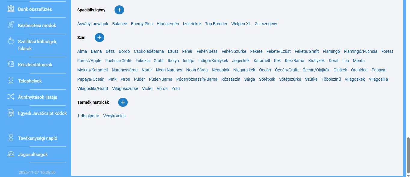 - A címkéket tartalmazó oldalon számos lehetőségből választhat – szín, íz, kiszerelés, stb. Keresse meg azt a típust, ami alapján az altermékeket rendezni kívánja. Ha például egy tápból szeretne többféle ízűt kínálni, keresse meg az „ÍZ” címkéket.