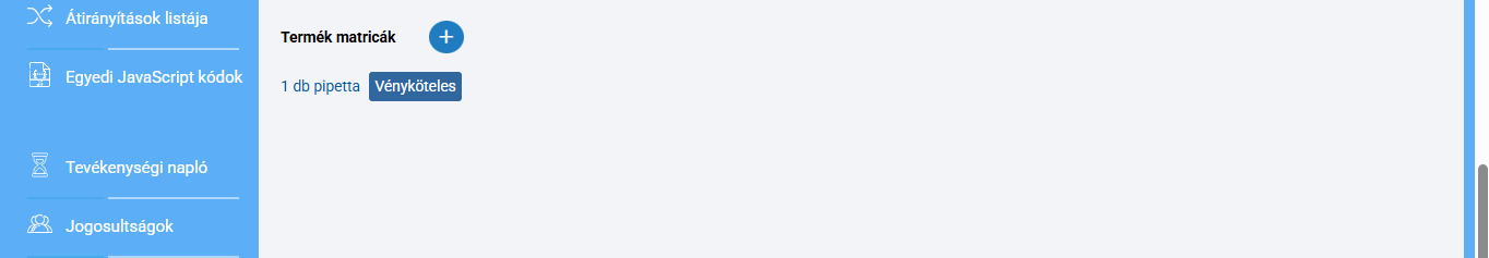 Ehhez kövesse a következő útvonalat: „TERMÉKEK” menü – „SZERKESZTÉS” opció – „ALTERMÉKEK” fül. A megnyíló oldalon listába szedve látja majd a korábban már létrehozott altermékeket, új feltöltéséhez azonban kattintson a „+” jelre.