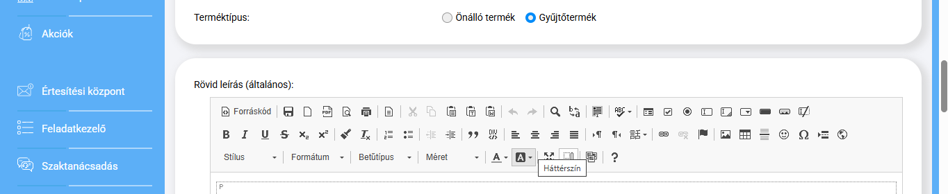 „TERMÉKTÍPUS” mező: Ebben a mezőben kiválaszthatja, hogy önálló terméket szeretne feltölteni, vagy éppen gyűjtőterméket. Önálló terméknek számít az a cikk, amiből nem értékesít többféle ízt, kiszerelést, színt, típust. (Nincs termék változó) Gyűjtőtermék az, aminél a vásárló többféle típusból választhat. Ilyen lehet a vitaminoknál a kiszerelés, tápoknál az íz, játékoknál a szín, méret, stb. A két terméktípus szerkesztése minimálisan eltér egymástól, ezt a későbbiekben fogjuk kifejteni.